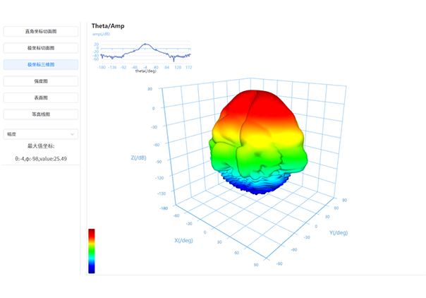 數(shù)據(jù)分析軟件具備球面近遠場變換功能,能夠根據(jù)測試方向圖分析各種極化形式天線的增益、方向性、波束最大點位置、波束指向、副瓣電平和位置、波束寬度、交叉極化等參數(shù);能夠?qū)崿F(xiàn)多文件比較分析;能夠進行用戶自定義特殊參數(shù)的計算;能夠自動生成報表并按需打印。