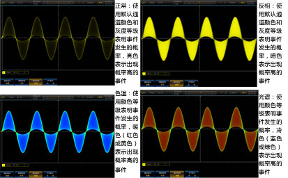 6914系列示波器采用數(shù)字熒光三維顯示技術(shù),通過顏色的亮暗或冷暖來表示事件發(fā)生的概率,并提供正常、反相、色溫、光譜等4種波形色彩,增強了查看偶發(fā)事件的能力。