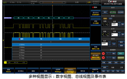 總線分析儀選件除了提供傳統(tǒng)的數(shù)字視圖外,還提供更高級別的總線視圖顯示,方便您識別各種總線包類型,如包開始、地址、數(shù)據(jù)及包結(jié)束等;您還可以采用帶有時間標(biāo)記的事件表形式查看捕獲的總線包。