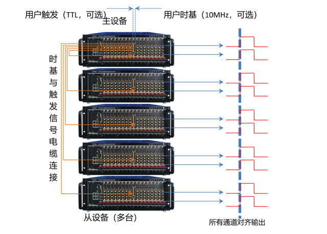 1652AM配備了獨特的高精度同步定時器,其采用新型高精度數字延遲架構,同步精度遠優(yōu)于傳統(tǒng)產品。 任意波模式下:同一模塊內四個通道同步精度可達30ps;不同模塊間、多機箱間通過定時同步器,實現高精度的信號輸出同步,同步精度同樣可達30ps;每個通道輸出信號的延時獨立可調,調節(jié)步進1ps級。