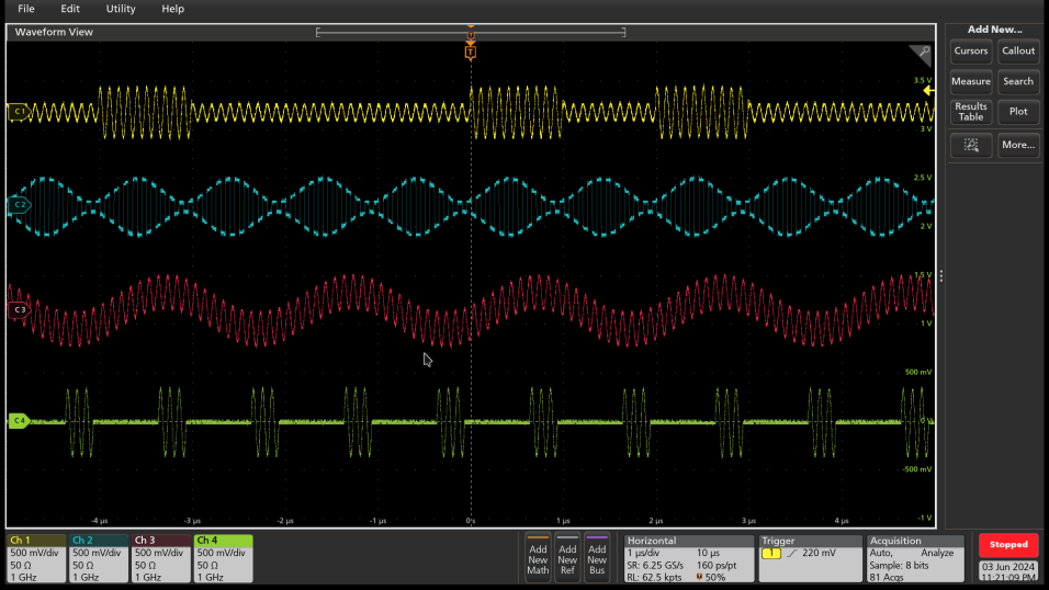 1653系列函數(shù)任意波形發(fā)生器包含120MHz、250MHz、350MHz、500MHz和1GHz 5種帶寬機(jī)型,滿足客戶不同輸出信號(hào)頻率的信號(hào)發(fā)生需求。500MHz帶寬及以下型號(hào)支持2或4個(gè)輸出通道,通道之間可耦合輸出,如CH2=CH1、CH2=~CH1,CH2=CH1+CH2等,通道CH1、CH2及CH3、CH4可作為差分信號(hào)輸出。
