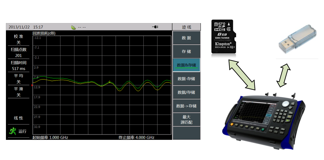 對(duì)測(cè)量跡線(xiàn)或狀態(tài)進(jìn)行存儲(chǔ),存儲(chǔ)介質(zhì)可選擇儀器內(nèi)部FLASH存儲(chǔ)器、SD卡、USB設(shè)備。