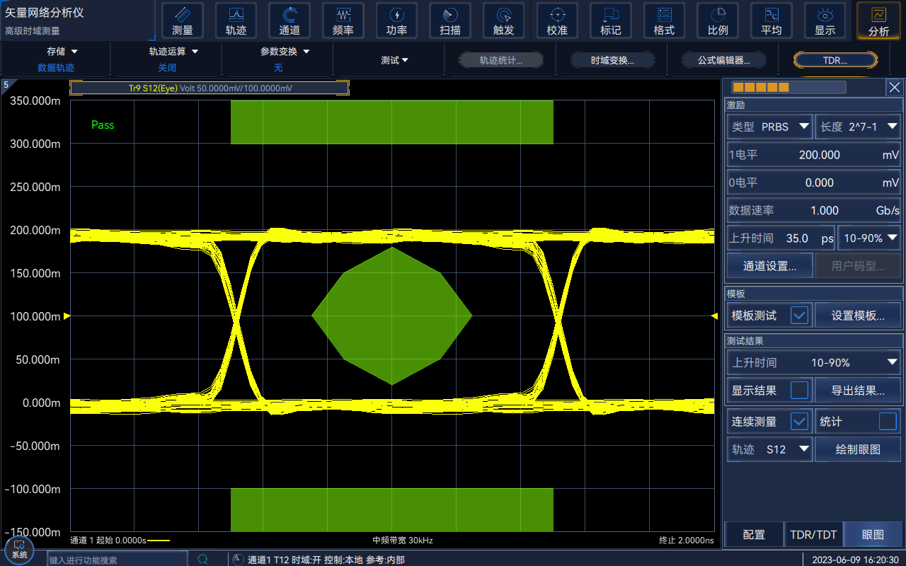 具備基于網(wǎng)絡(luò)參數(shù)的虛擬眼圖生成及分析功能。根據(jù)不同的高速數(shù)字通信標(biāo)準(zhǔn),可以使用預(yù)先定義好的眼圖模板進(jìn)行高效Pass/Fail測試??梢栽诜抡嫜蹐D施加抖動、噪聲等干擾,通過預(yù)加重和均衡等校正算法的加入。模擬真實環(huán)境下高速鏈路不同位置的仿真眼圖。