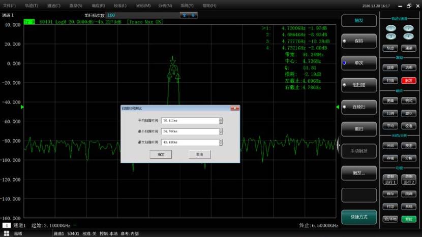 3650系列矢量網(wǎng)絡(luò)分析儀全頻段掃描,201點,600kHz中頻帶寬情況下掃描速度可達(dá)43ms,并提供一鍵式掃描時間測試功能,方便評估。