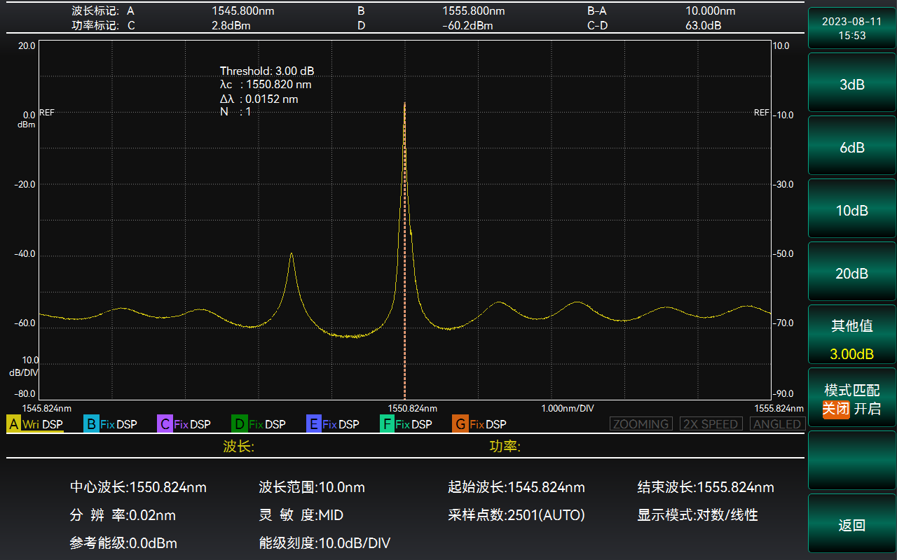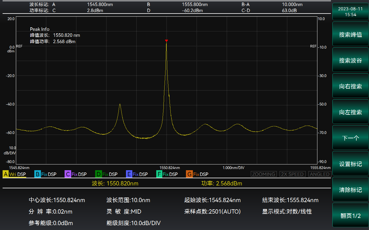 6362D光譜分析儀(光譜儀)具備多場景光譜分析功能,針對DFB-LD等單縱模激光光源,儀器提供閾值分析和邊模抑制比分析兩種分析方法,有效準(zhǔn)確的評估單縱模待測光源的中心波長、光譜帶寬和邊模抑制比。