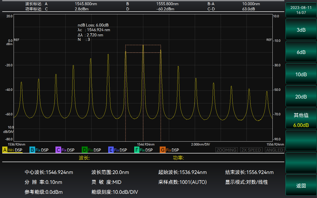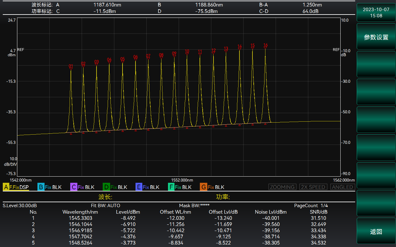 除半導(dǎo)體激光光源光譜測量應(yīng)用外,儀器還集成了光纖偏振模色散測量應(yīng)用、波分復(fù)用應(yīng)用、光纖放大器應(yīng)用、波分復(fù)用濾波器應(yīng)用、波分復(fù)用光纖放大器應(yīng)用等光譜應(yīng)用功能,下圖是典型的波分復(fù)用應(yīng)用分析。