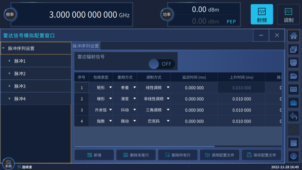 支持幅度調(diào)制、頻率調(diào)制、相位調(diào)制及脈沖調(diào)制。具備雙脈沖、脈沖串、重頻參差、重頻抖動、重頻滑變等復(fù)雜脈沖調(diào)制功能。