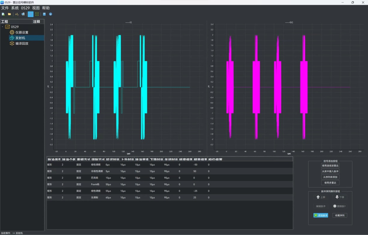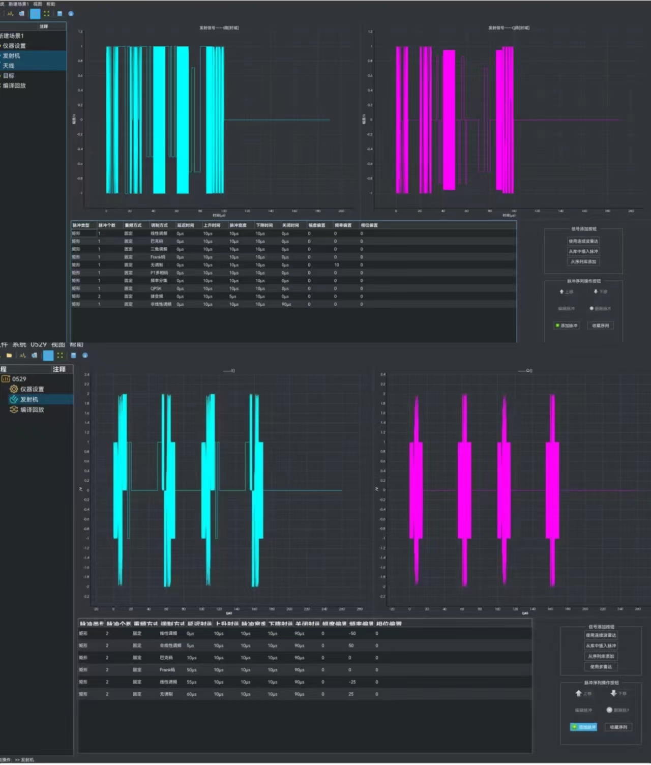 雷達(dá)信號(hào)模擬軟件支持脈內(nèi)多調(diào)制及同時(shí)到達(dá)多脈沖信號(hào)模擬功能,用戶可以在一個(gè)脈沖內(nèi)添加多種調(diào)制方式的雷達(dá)信號(hào)以及進(jìn)行多雷達(dá)信號(hào)同時(shí)到達(dá)模擬。圖為雷達(dá)信號(hào)模擬軟件建立的脈內(nèi)多調(diào)制信號(hào)模擬界面和多雷達(dá)信號(hào)同時(shí)到達(dá)模擬界面,該脈沖信號(hào)內(nèi)部包含多種雷達(dá)信號(hào)樣式,每種雷達(dá)信號(hào)具有不同的調(diào)制樣式。