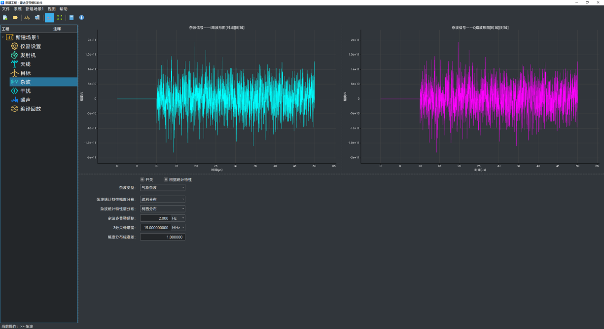 雷達(dá)信號(hào)模擬軟件可模擬豐富的雷達(dá)背景信號(hào),支持雜波、干擾、噪聲等背景信號(hào)模擬,結(jié)合目標(biāo)信號(hào)模擬,為驗(yàn)證雷達(dá)復(fù)雜背景下目標(biāo)檢測(cè)性能和接收通道射頻性能提供了可能。軟件可模擬地雜波、海雜波和氣象雜波,涵蓋不同種類雷達(dá)所面臨的雜波環(huán)境。此外,雷達(dá)信號(hào)模擬軟件可以直接通過(guò)雜波類型或雜波統(tǒng)計(jì)特性對(duì)雜波進(jìn)行建模仿真。圖為軟件模擬產(chǎn)生的氣象雜波信號(hào),幅度服從瑞利分布,譜分布為柯西分布。