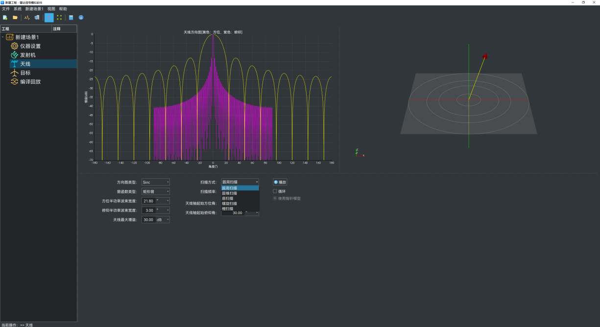 支持模擬多種天線掃描方式,并可自定義設(shè)置天線方向圖。