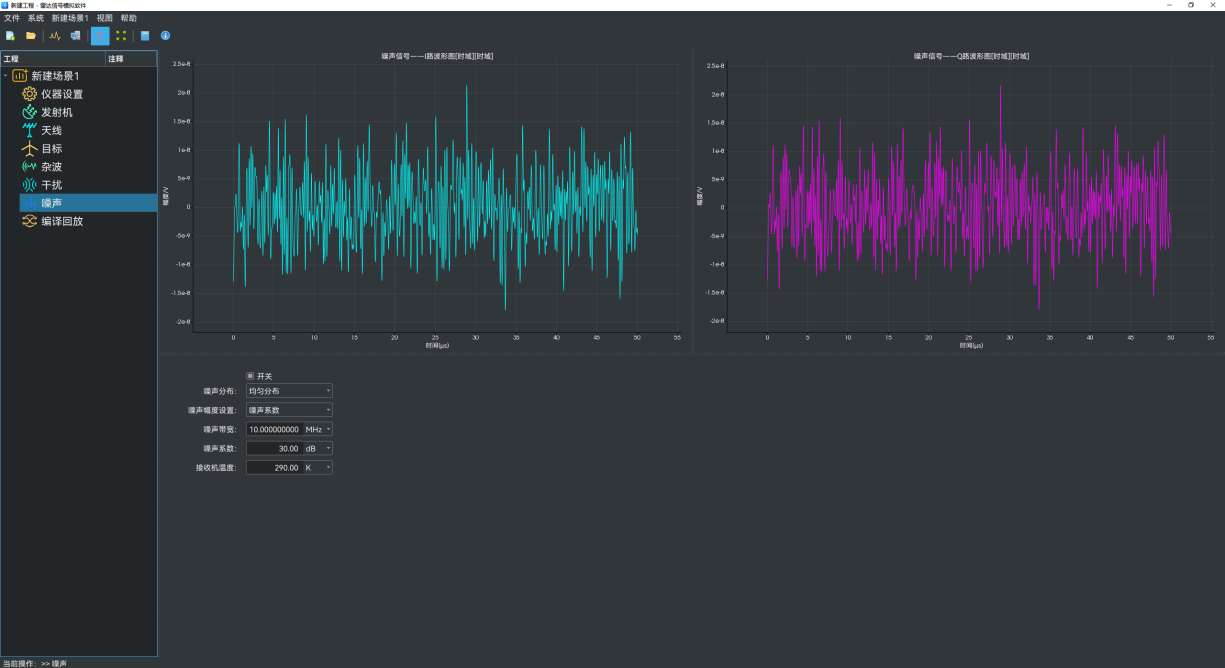 雷達(dá)信號(hào)模擬軟件可模擬兩類干擾信號(hào),一類為無(wú)源干擾信號(hào),一類為有源干擾信號(hào)。無(wú)源干擾主要指箔條干擾信號(hào),有源干擾信號(hào)又分為壓制式干擾信號(hào)和欺騙式干擾信號(hào)。此外,雷達(dá)信號(hào)模擬軟件還可模擬產(chǎn)生均勻分布和高斯分布兩類噪聲信號(hào),用于模擬現(xiàn)實(shí)雷達(dá)回波信號(hào)中的噪聲信號(hào)。圖為信號(hào)模擬軟件模擬具有均勻分布的噪聲信號(hào)。