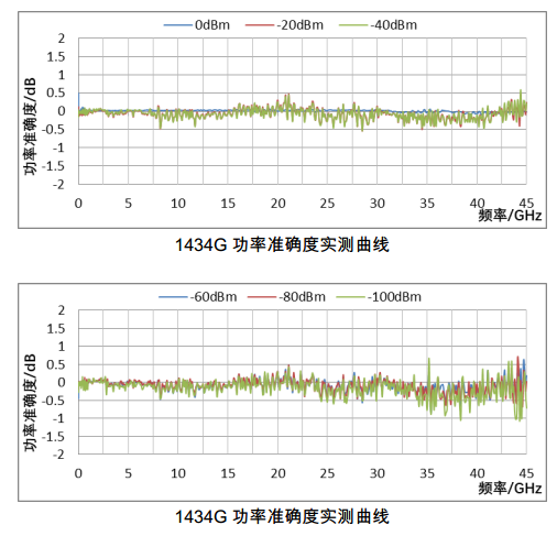 1434A標配高可靠大動態(tài)電子衰減器,1434D/G選配機械衰減器,最小輸出功率達-120dBm。最大輸出功率達+25dBm(2GHz)、+20dBm(20GHz)、+16dBm(45GHz),功率準確度<0.5dB(測量值)。