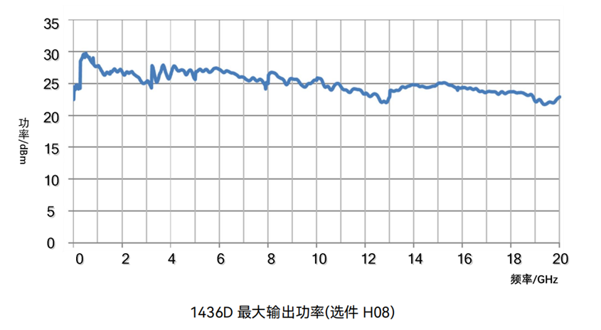 通過選配H08大功率輸出選件,1436A/B/C/D全頻段功率實(shí)測(cè)值均在20dBm以上;1436F全頻段功率實(shí)測(cè)值在17dBm以上,30GHz~40GHz頻段內(nèi)功率實(shí)測(cè)值在20dBm以上。在需要大功率激勵(lì)信號(hào)的測(cè)試場(chǎng)合,使用1436無需外接放大器,即可得到所需測(cè)試信號(hào)。