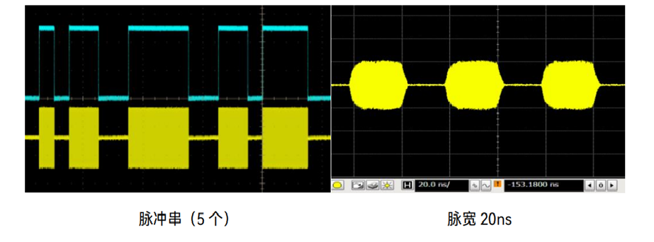脈沖開關(guān)比大于80dB,上升下降時(shí)間小于10ns,選用窄脈沖選件H04,最小脈寬20ns,脈寬范圍20ns~42s-10ns,步進(jìn)10ns,支持門控、外部等多種觸發(fā)方式。