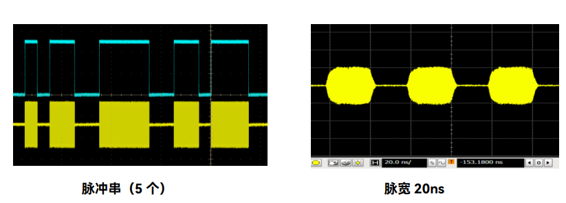 脈沖開關(guān)比大于80dB,上升下降時間小于10ns,選用窄脈沖選件H04,最小脈寬20ns,脈寬范圍20ns~42s-10ns,步進10ns,支持門控、外部等多種觸發(fā)方式,具備測試所需要的脈沖串功能。